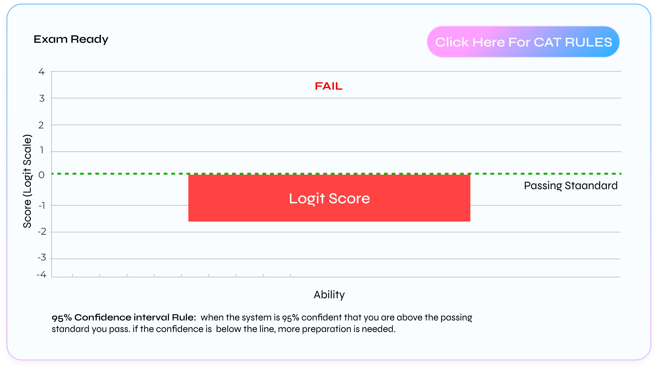 Track your readiness in real time with a live progress gauge showing CAT exam performance and proximity to passing standard.